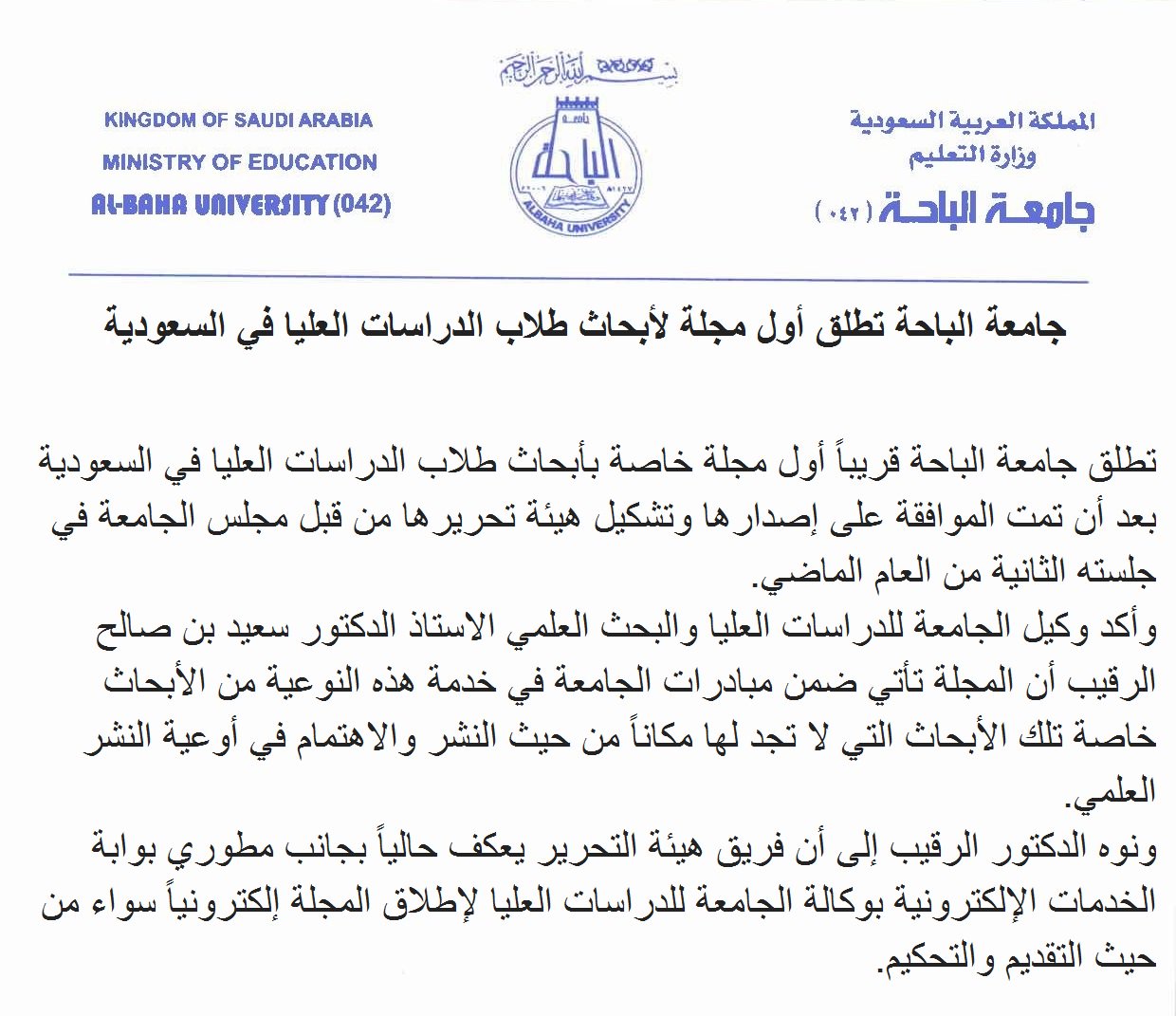 جامعة الباحة En Twitter جامعة الباحة تطلق أول مجلة لأبحاث طلاب الدراسات العليا في السعودية