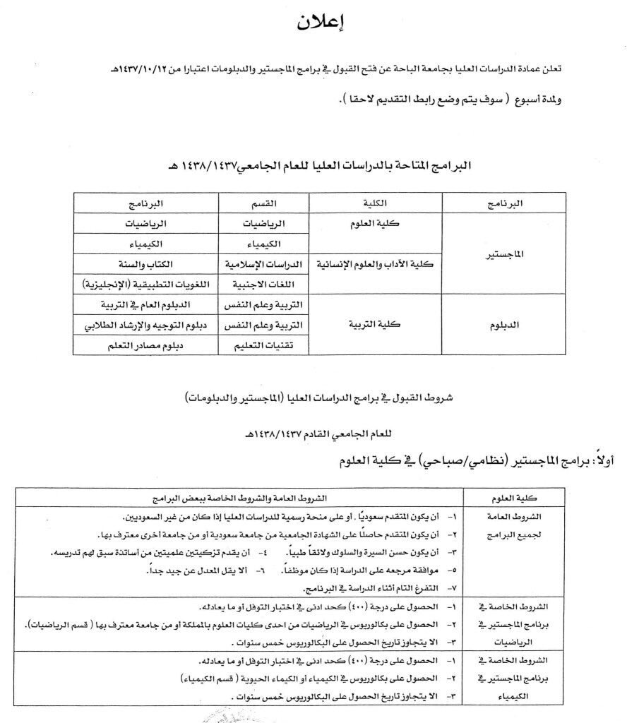 وافي عبد الله On Twitter جامعة الباحة تفتح التقديم على ٧برامج دراسات عليا في ١٢شوال هنا تفاصيل البرامج والشروط شكرا لكل من أفادنا بالإعلان